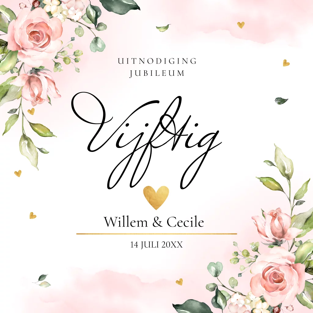Uitnodiging jubileum feest huwelijk 50 jaar getrouwd bloemen roze