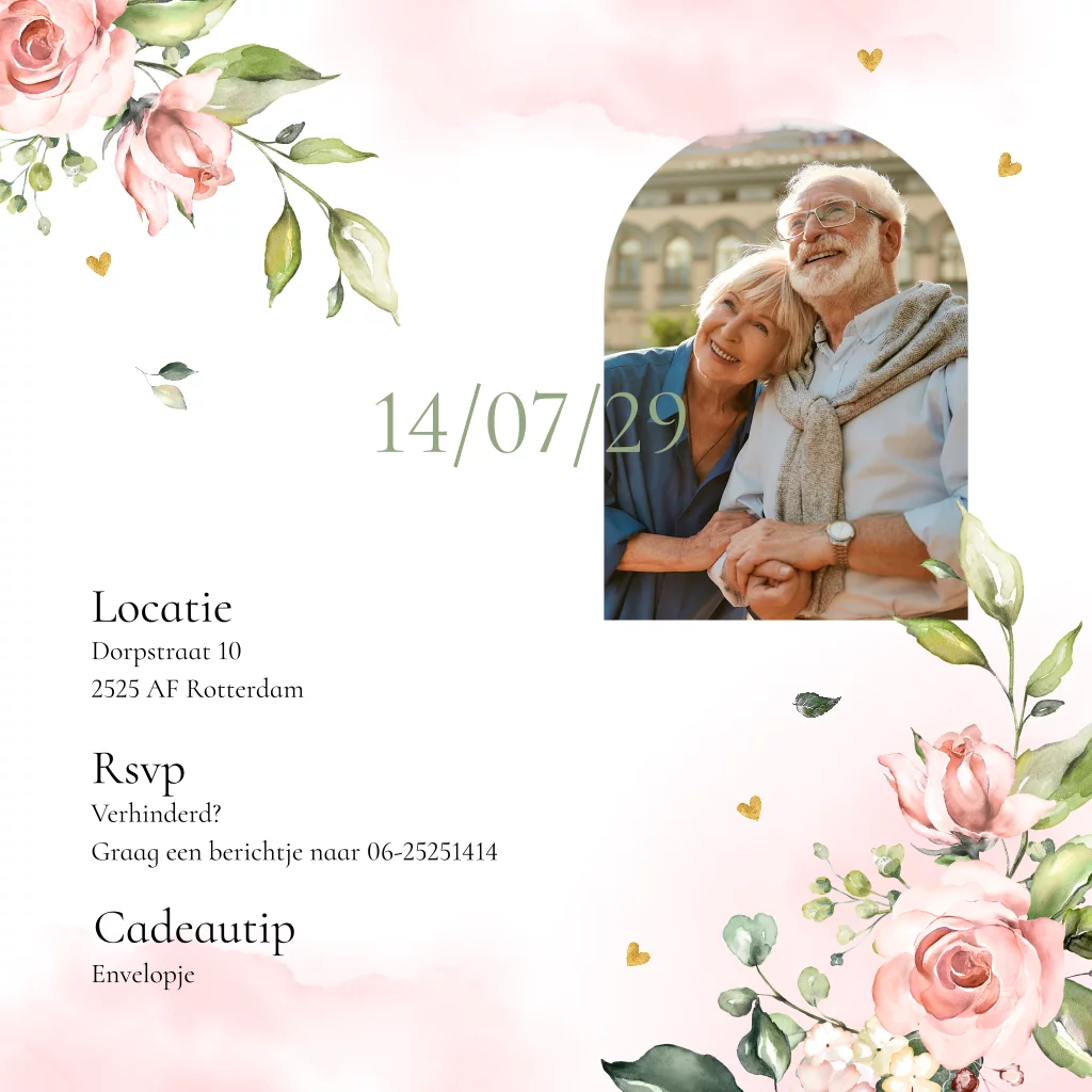 Uitnodiging jubileum feest huwelijk 50 jaar getrouwd met roze watercolour, zomerse bloemen en goudlook. Geen folie!