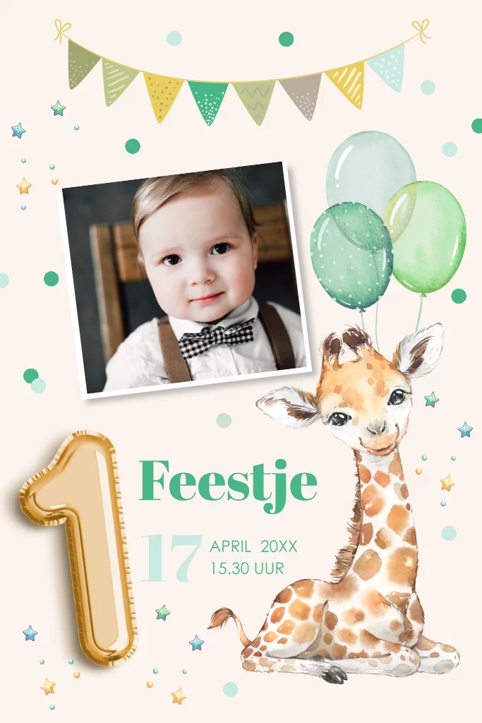 Uitnodiging kinderfeestje voor een jongen 1 jaar met foto, slinger, ballonnen en giraffe.
