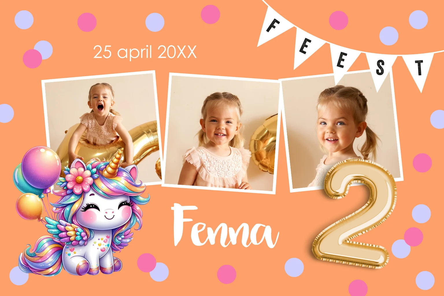 Uitnodiging kinderfeestje 2 jaar voor een meisje met fotocollage, eenhoorn, slinger en confetti. Pas de kleuren naar wens aan!