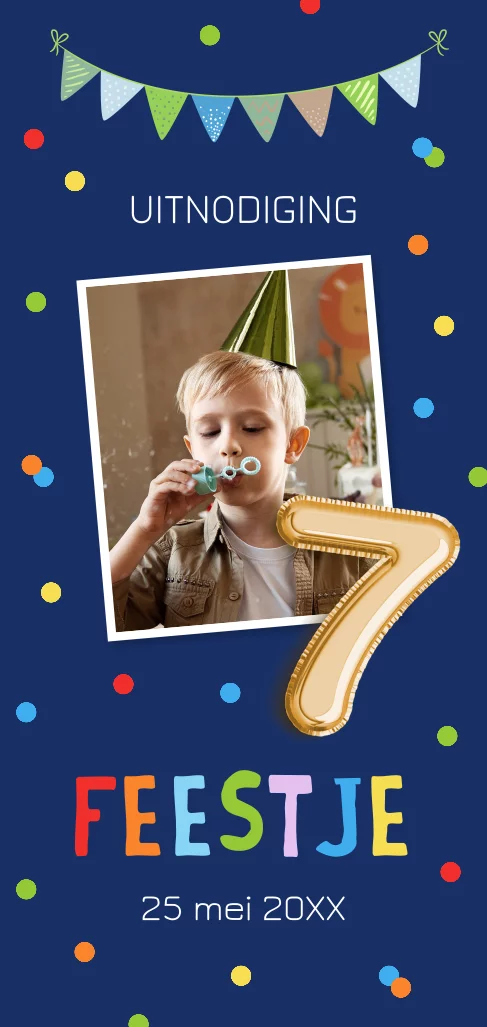 Uitnodiging kinderfeestje jongen 7 jaar foto confetti slinger
