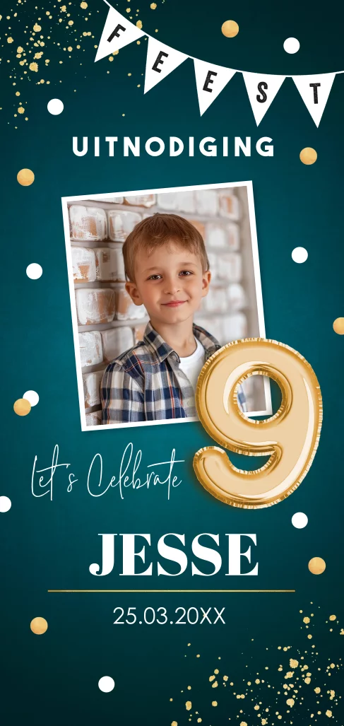 Uitnodiging kinderfeestje langwerpig voor een jongen 9 jaar met foto, slinger en confetti.
