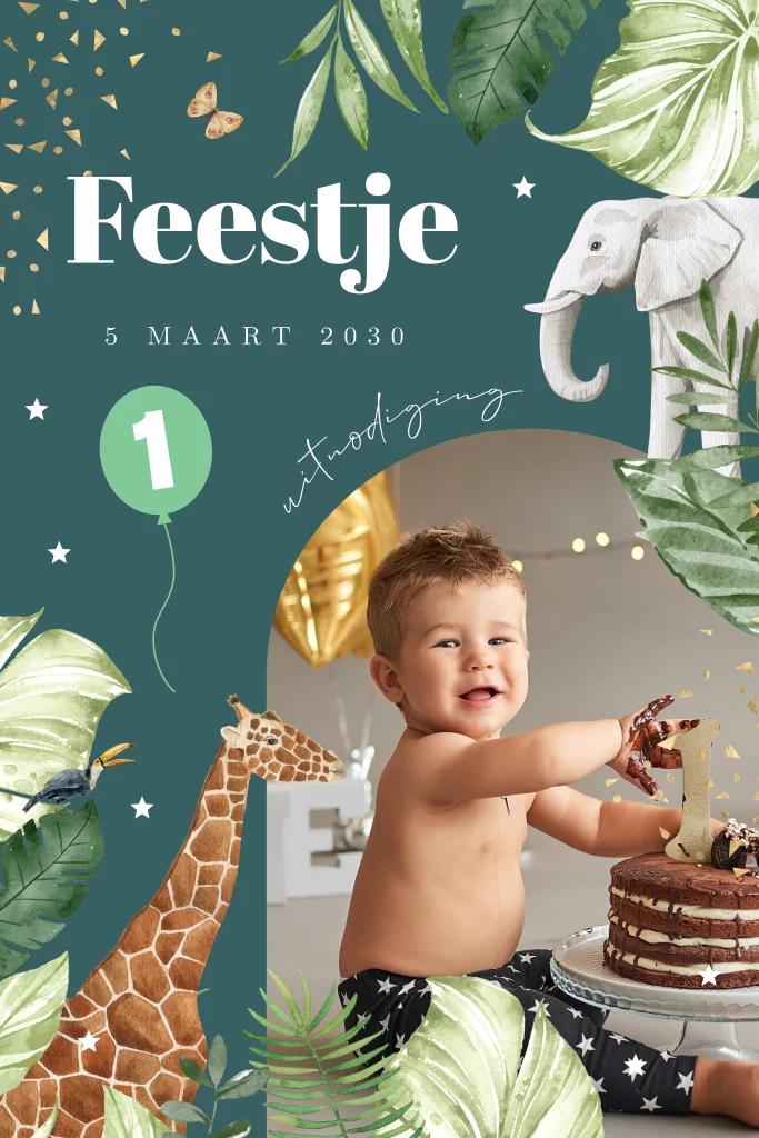 Uitnodiging kinderfeestje voor een jongen of meisje met jungle dieren, olifant, giraffe, tropische bladeren en eigen foto in boog vorm en goudfolie.