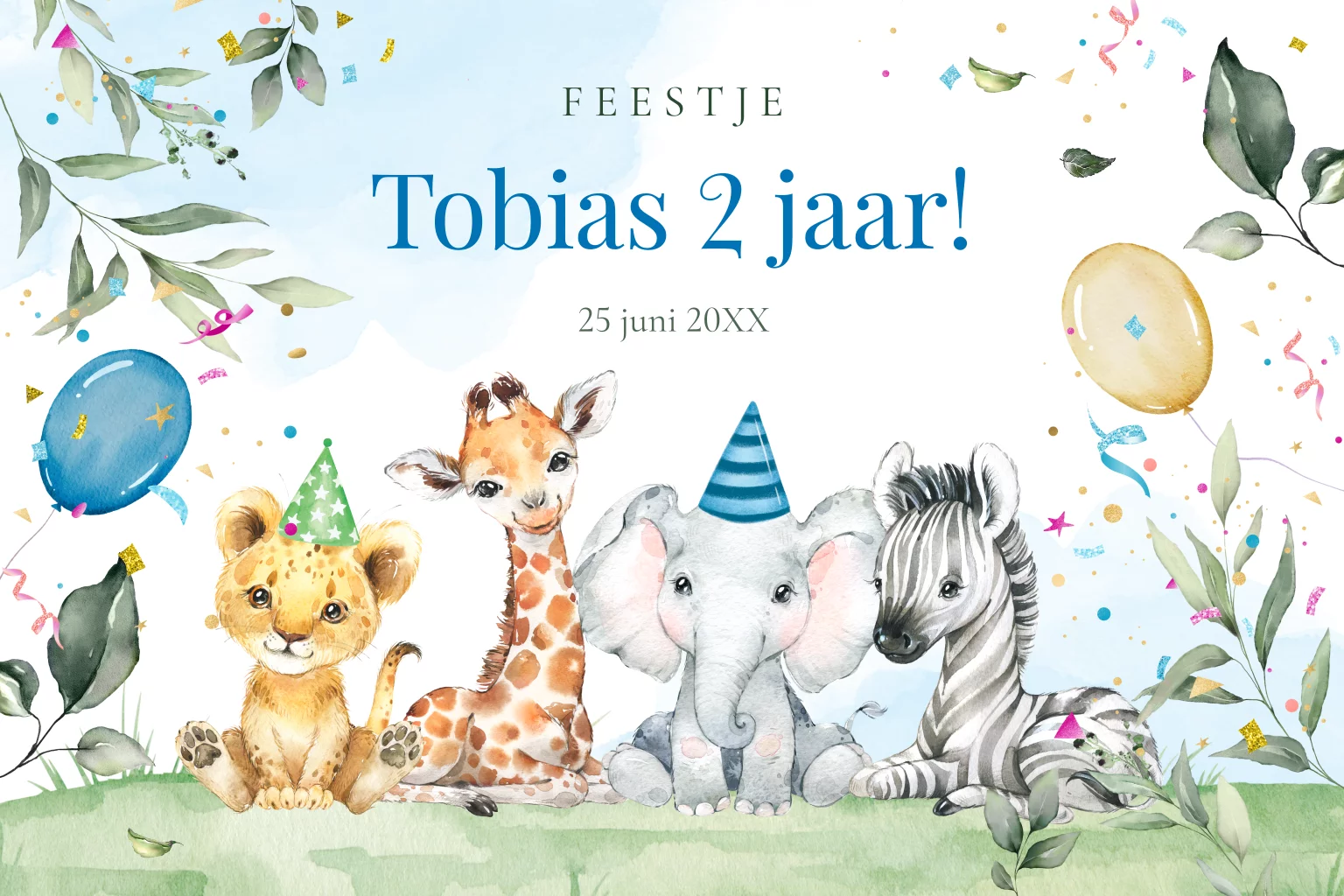 Uitnodiging kinderfeestje jongen 2 jaar met jungle safari dieren en ballonnen. Voeg op de achterkant van de kaart een mooie foto toe.
