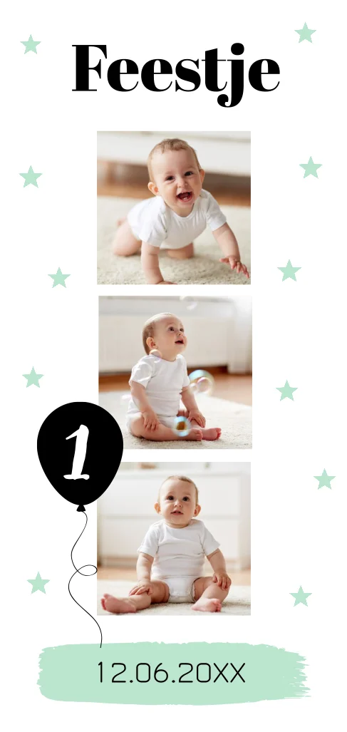 Uitnodiging kinderfeestje voor een jongen met sterren mintgroen, ballon en fotocollage.