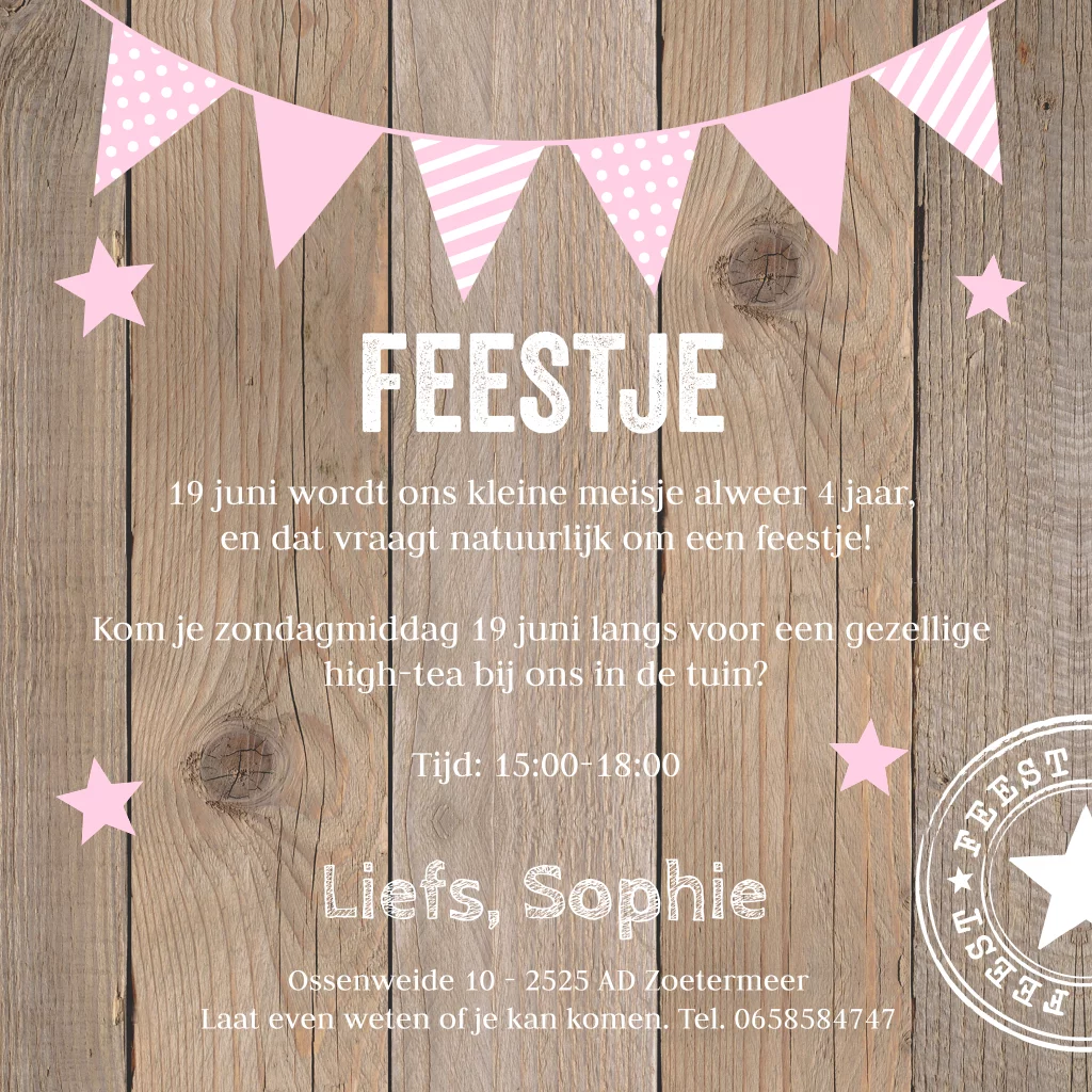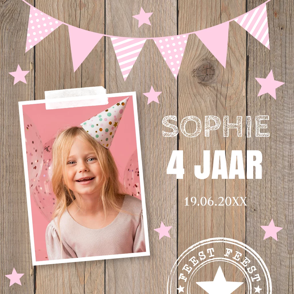 Uitnodiging kinderfeestje voor een meisje met foto, roze slinger, sterren en houtlook.
