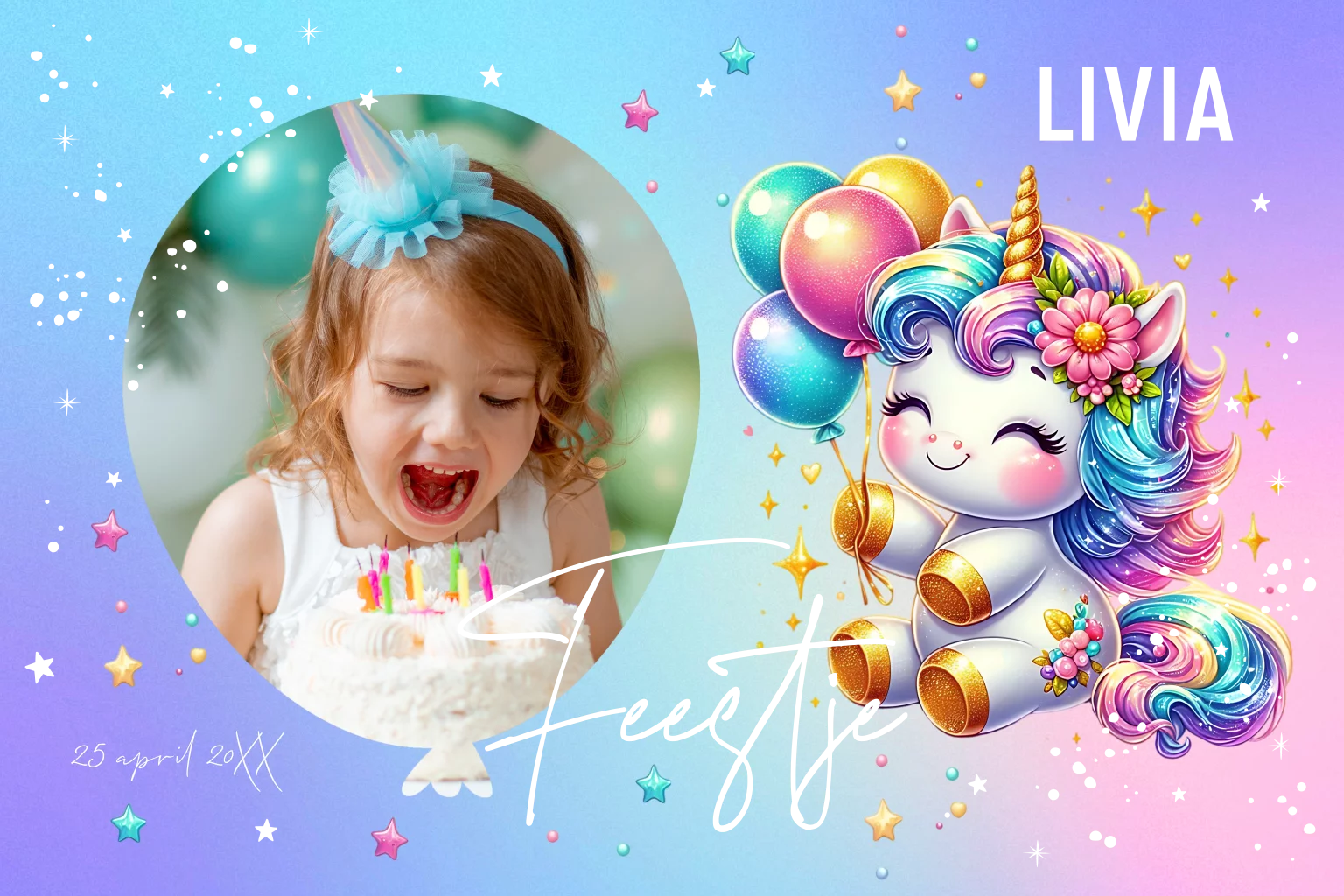 Uitnodiging kinderfeestje voor een meisje met eenhoorn, eigen foto in ballon met een trendy holografische print en goudfolie.