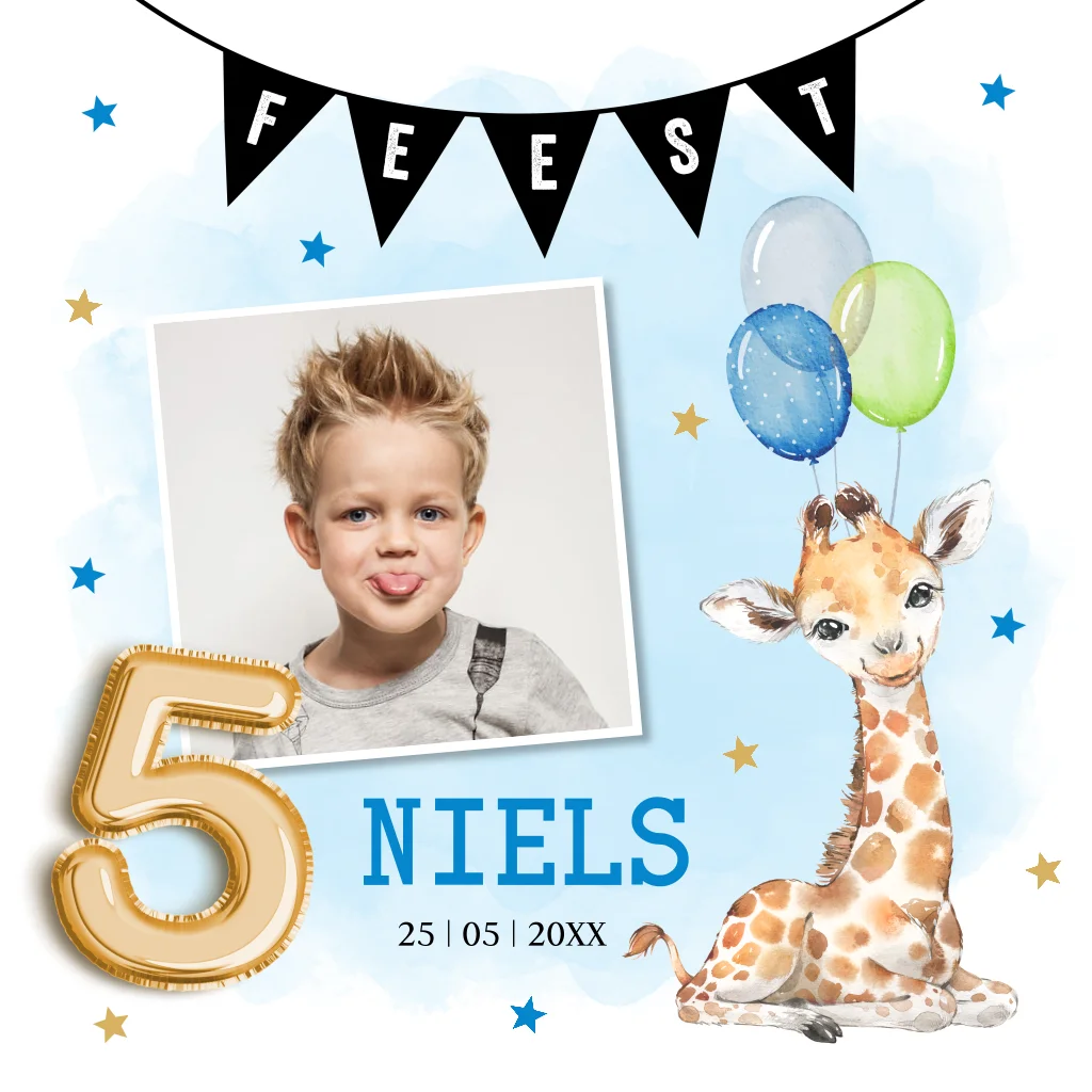 Uitnodiging kinderfeestje 5 jaar foto jongen giraffe ballon