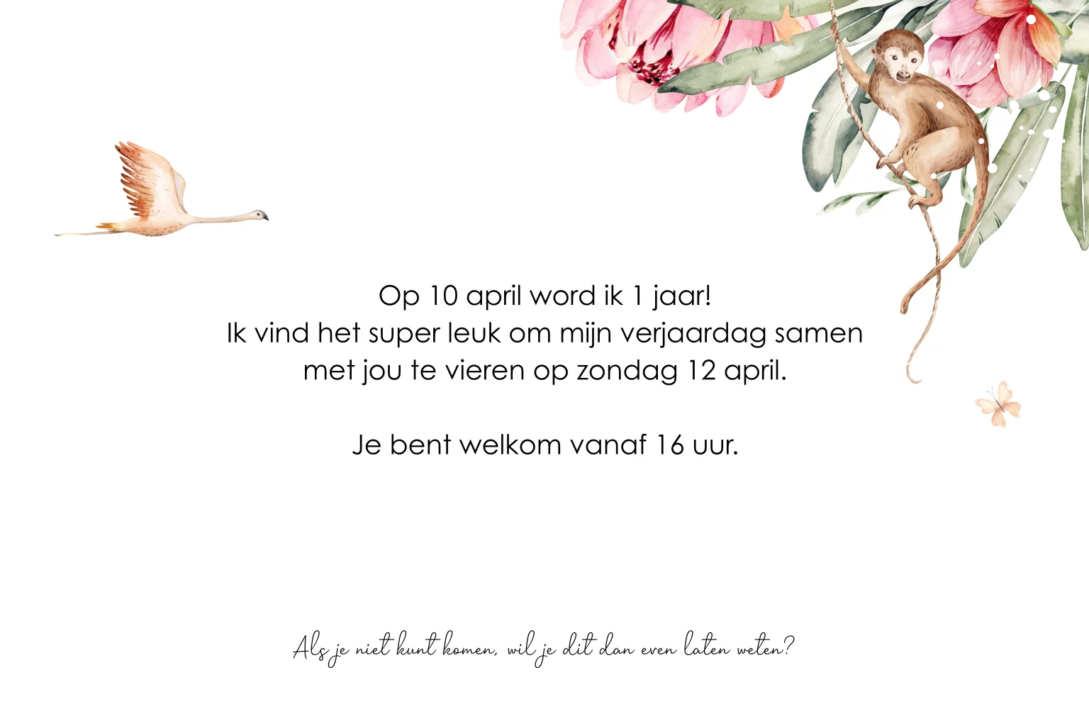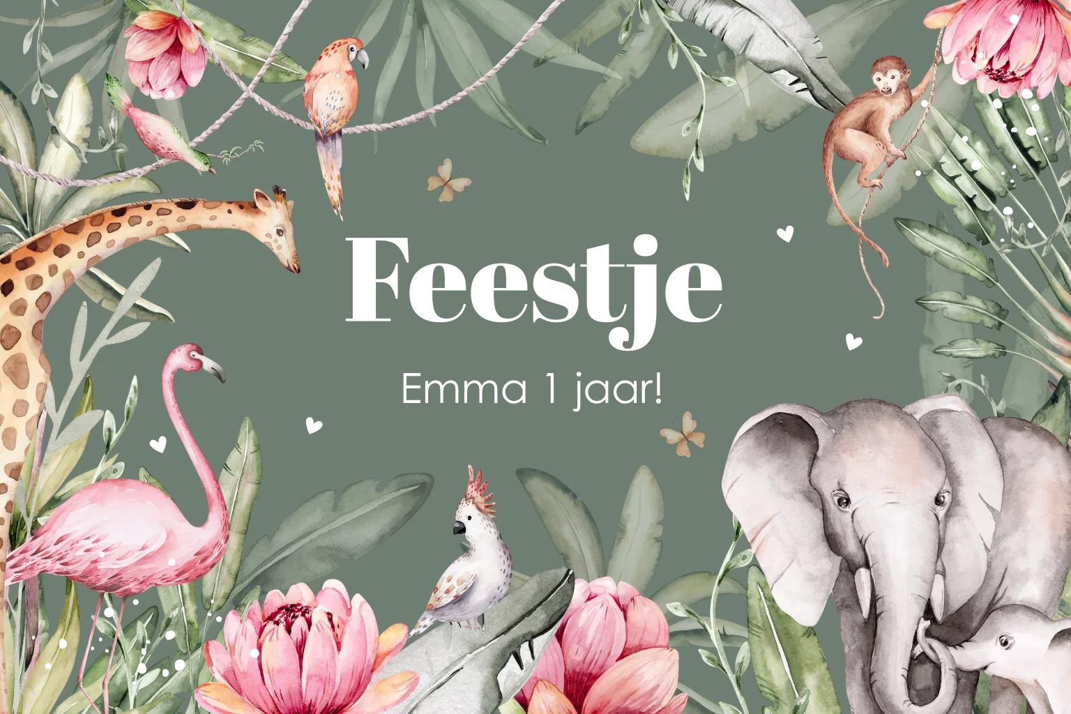 Uitnodiging kinderfeestje voor een meisje met jungle dieren en goudfolie. Kies voor deze superleuke uitnodiging met olifantje, giraffe, flamingo, aapje, vogels en vlinders.