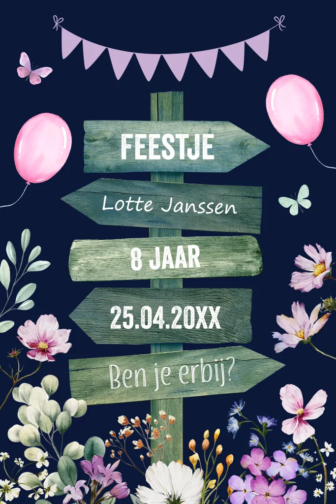 Uitnodiging kinderfeestje meisje met houten wegwijzer, zomerse gekleurde bloemen en lampjes. Plaats op de achterkant een mooie foto.