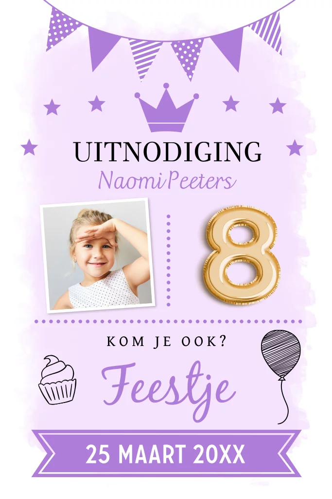Uitnodiging kinderfeestje meisje paars 8 jaar slinger typografie