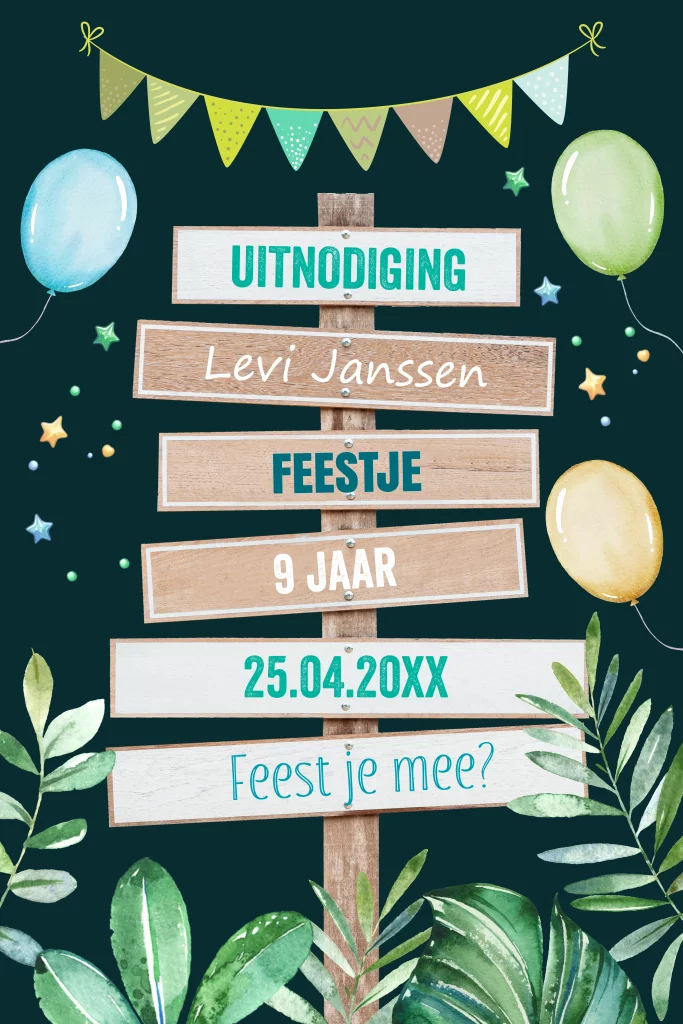 Uitnodiging kinderfeestje voor een jongen met houten wegwijzer, lampjes en tropische bladeren groen. Plaats op de achterkant een mooie foto.