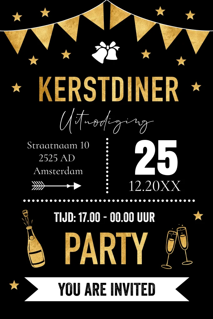 Kerstdiner uitnodiging zwart met goudlook typografie, slinger, champagneglazen en sterren.