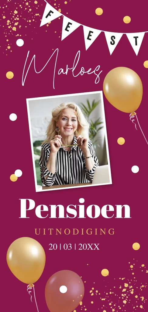 Pensioen uitnodiging langwerpig roze met foto, confetti, ballonnen en goudlook.
