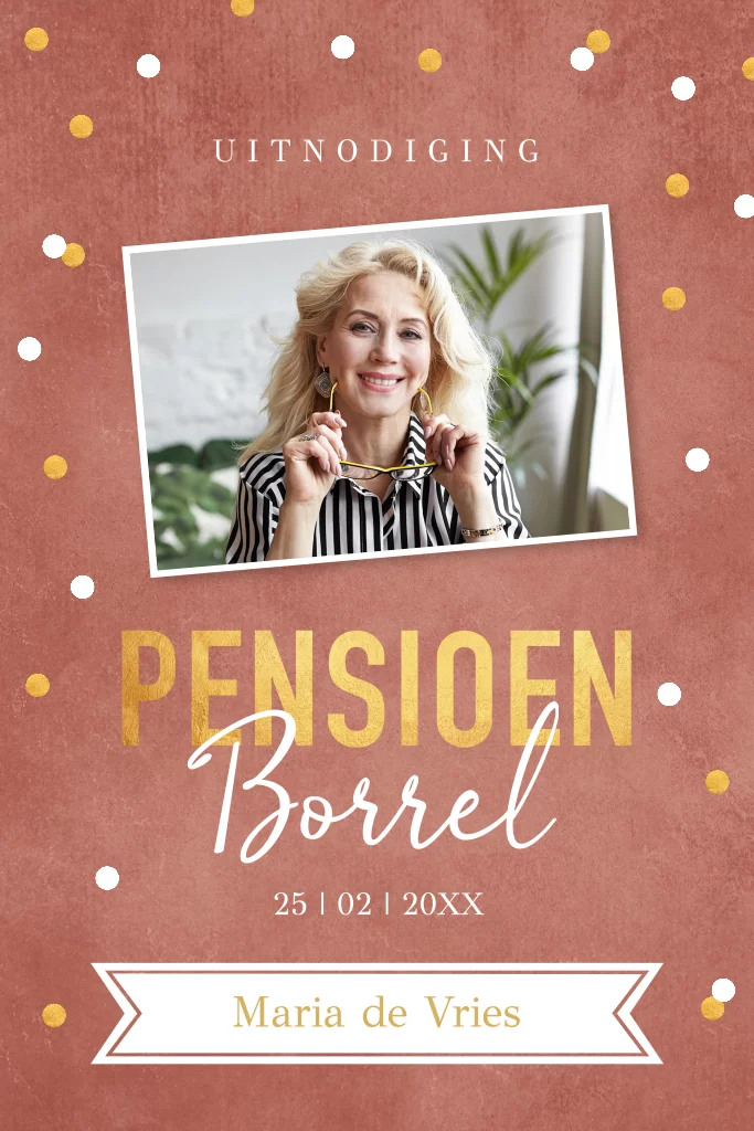 Uitnodiging pensioen feest voor een vrouw roze, eigen foto en goudlook confetti. Nodig je gasten uit met deze feestelijke pensioenkaart!