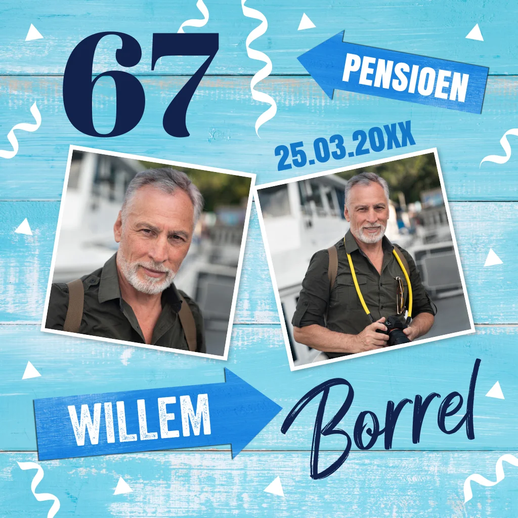 Pensioen feest uitnodiging voor een man blauw met eigen foto's, feestelijke confetti en houtlook.