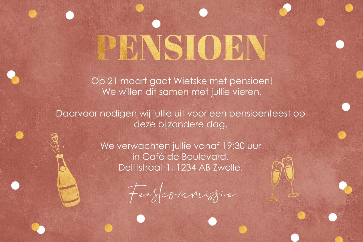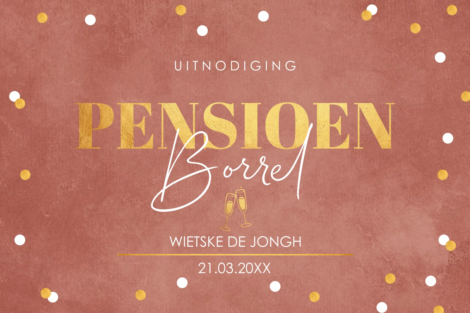 Pensioen uitnodiging roestbruin voor een vrouw met goudlook confetti. Geen folie!