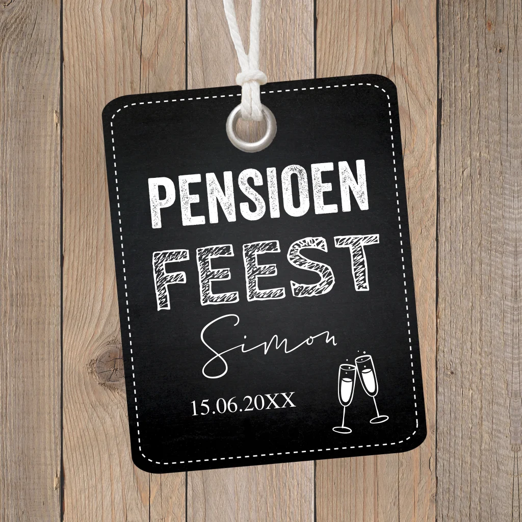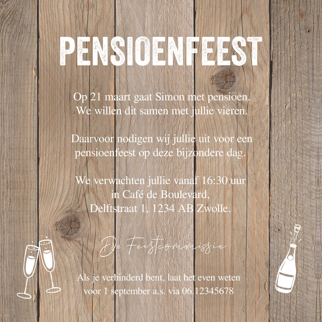 Uitnodiging pensioen feest met labelprint en houtlook achtergrond.