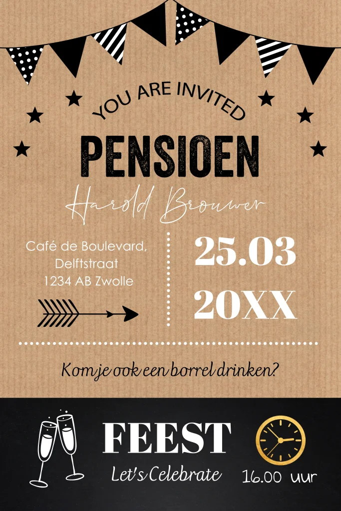 Pensioen uitnodiging kaart met bruin kraftlook, mooie typografie en zwart-wit slinger.
