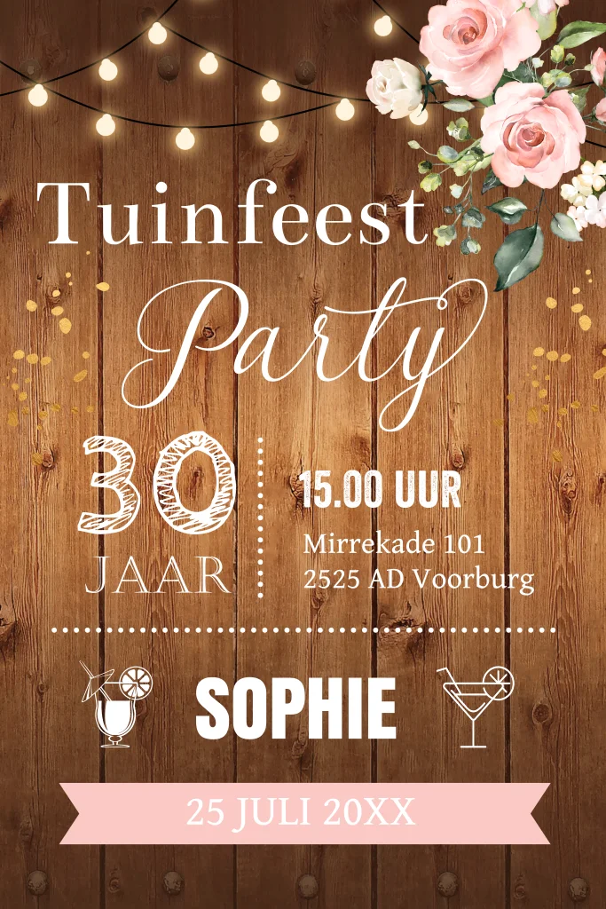 Uitnodiging tuinfeest verjaardag met hout print, roze bloemen en lampjes.