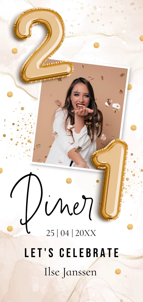 Uitnodiging verjaardag 21 diner party langwerpig met beige marmer look, eigen foto, spetters, balonnen en goudlook confetti.