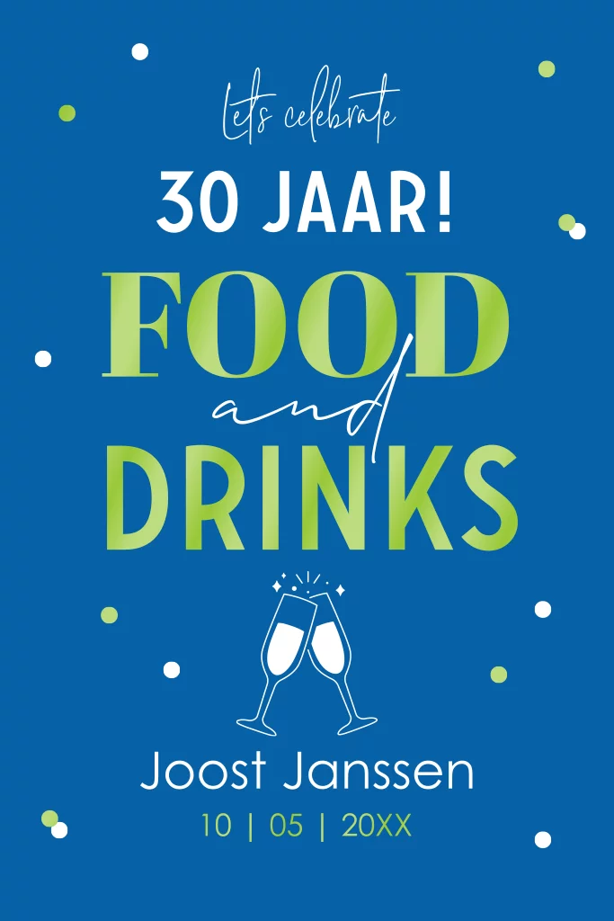 Uitnodiging verjaardag 30 jaar foods and drinks hoogglans blauw