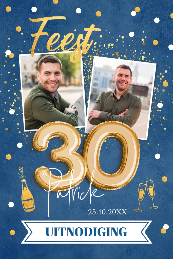 Uitnodiging verjaardag 30 jaar blauw een man met foto's, ballonnen, feestelijke confetti en goudlook.