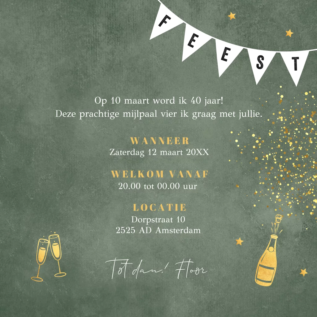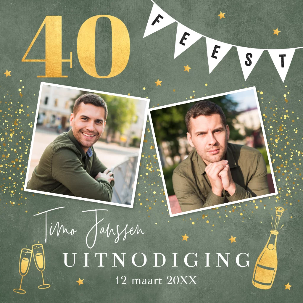 Uitnodiging verjaardag 40 jaar groen voor een man met foto's, goudlook champagne, slinger en feestelijke confetti. Geen folie!