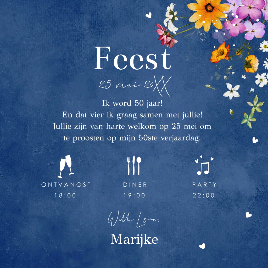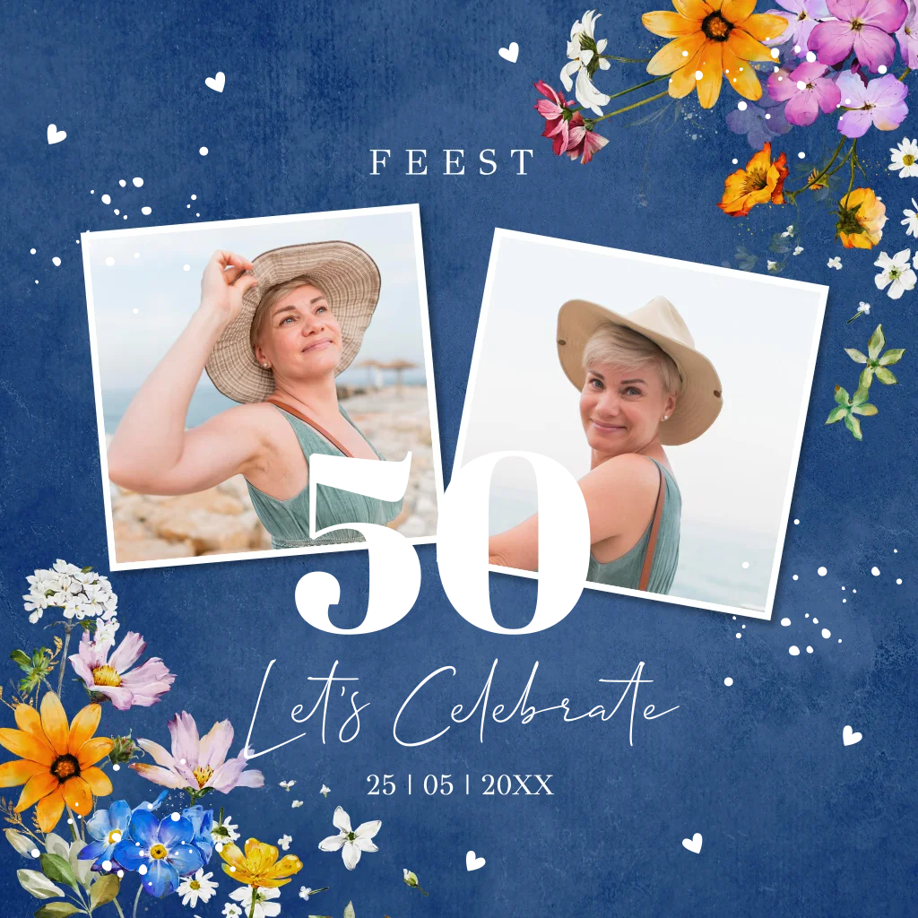 Uitnodiging verjaardag 50 jaar voor een vrouw met foto's, zomerse bloemen en goudfolie.
