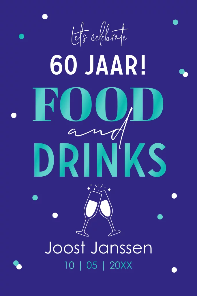 Uitnodiging verjaardag 60 jaar met moderne typografie. Met tekst food and drinks en hoogglans.