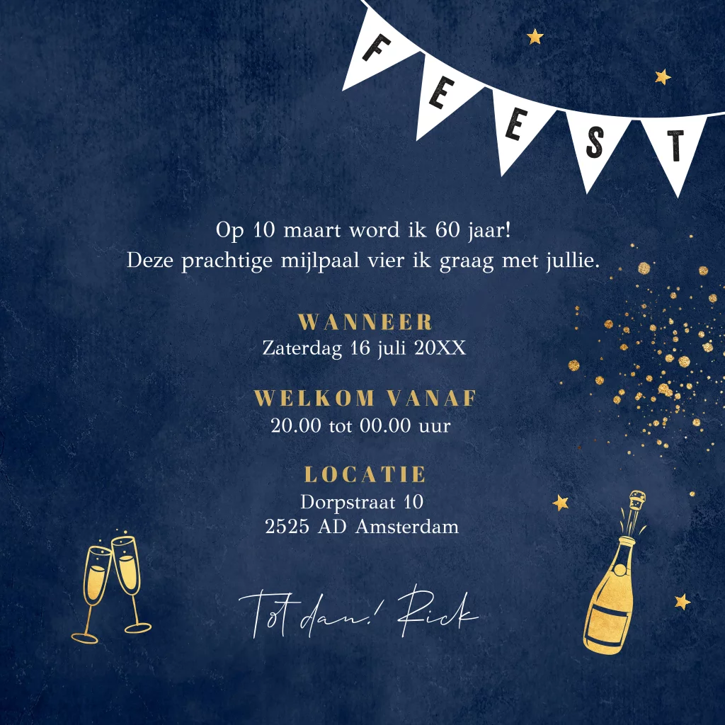 Uitnodiging verjaardag 60 jaar blauw met foto's, goudlook champagne, slinger en feestelijke confetti. Geen folie!