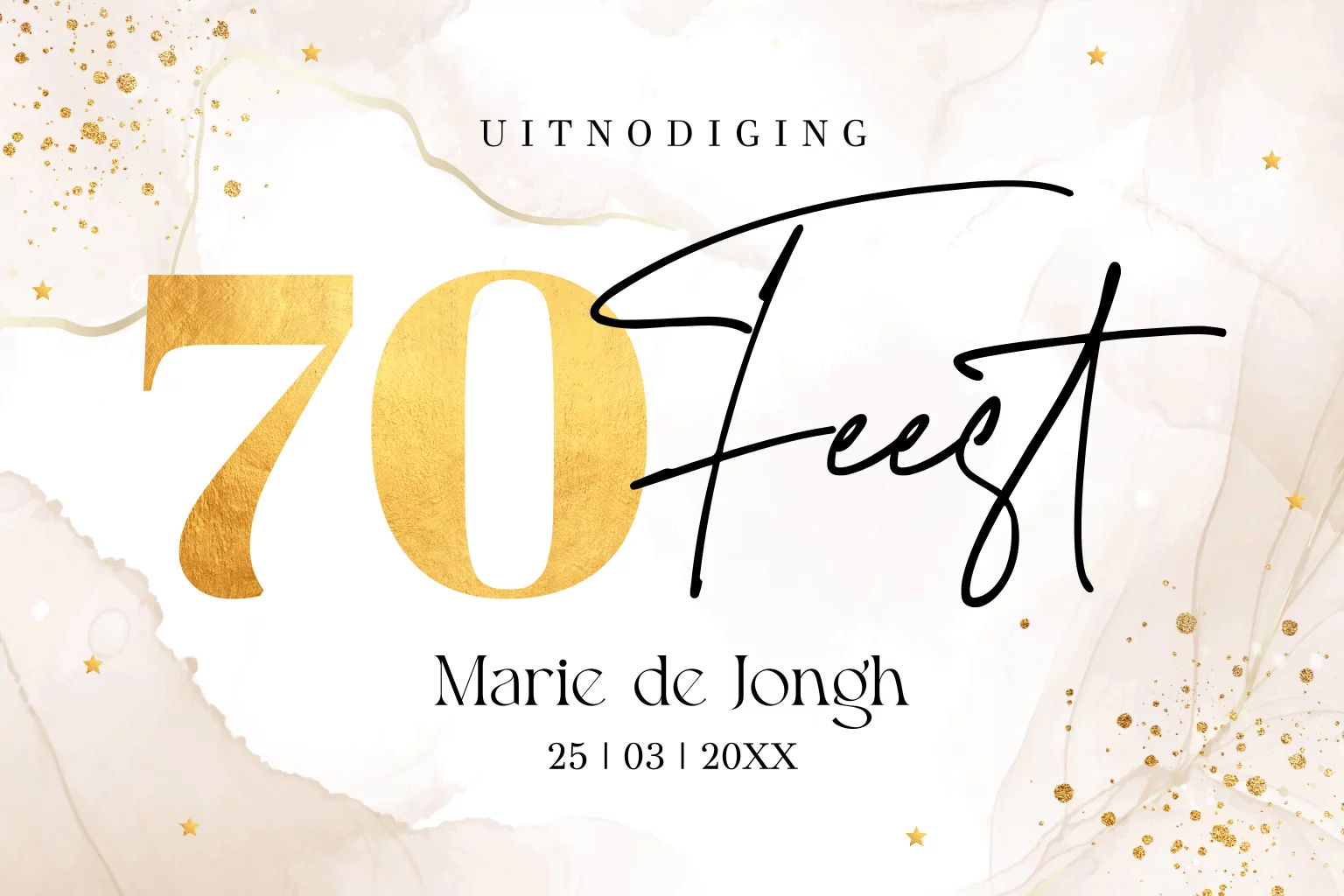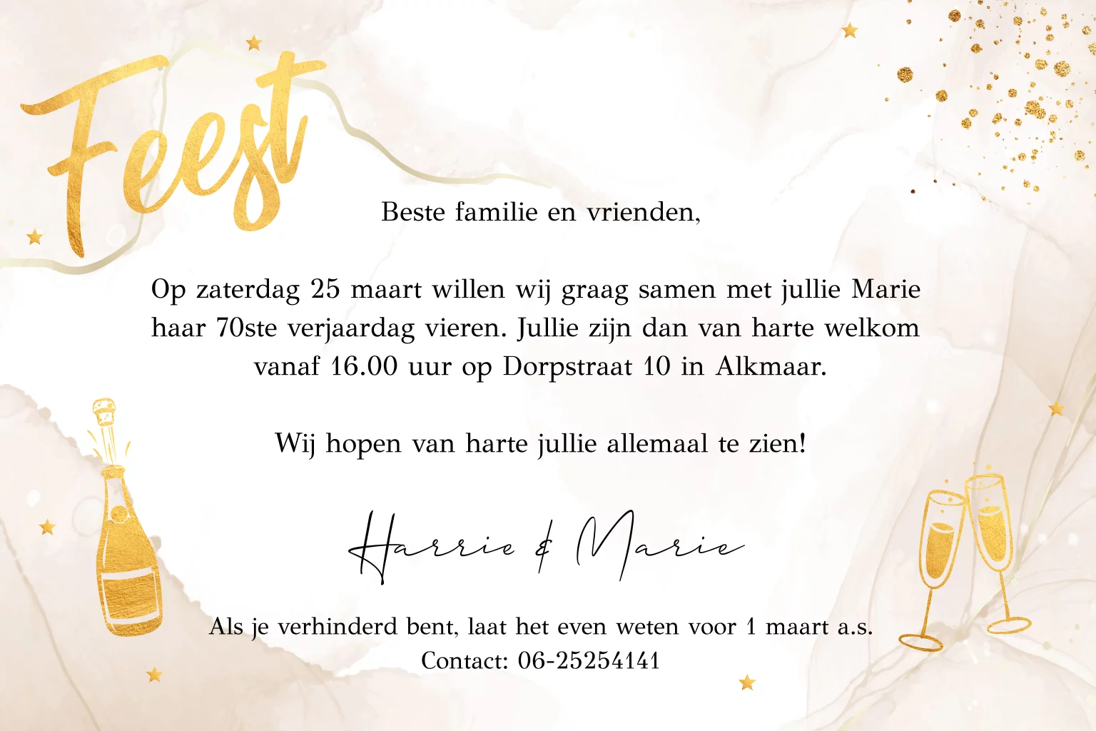 Uitnodiging verjaardag 70 jaar beige watercolour met goudlook spetters. Geen folie!