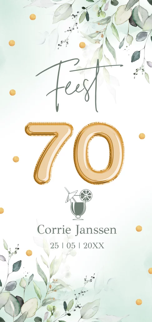Uitnodiging verjaardag langwerpig voor een vrouw 70 jaar met goudlook en botanisch groene bladeren.