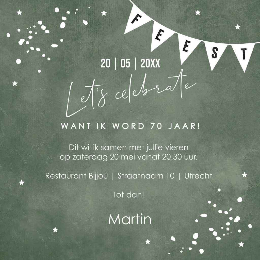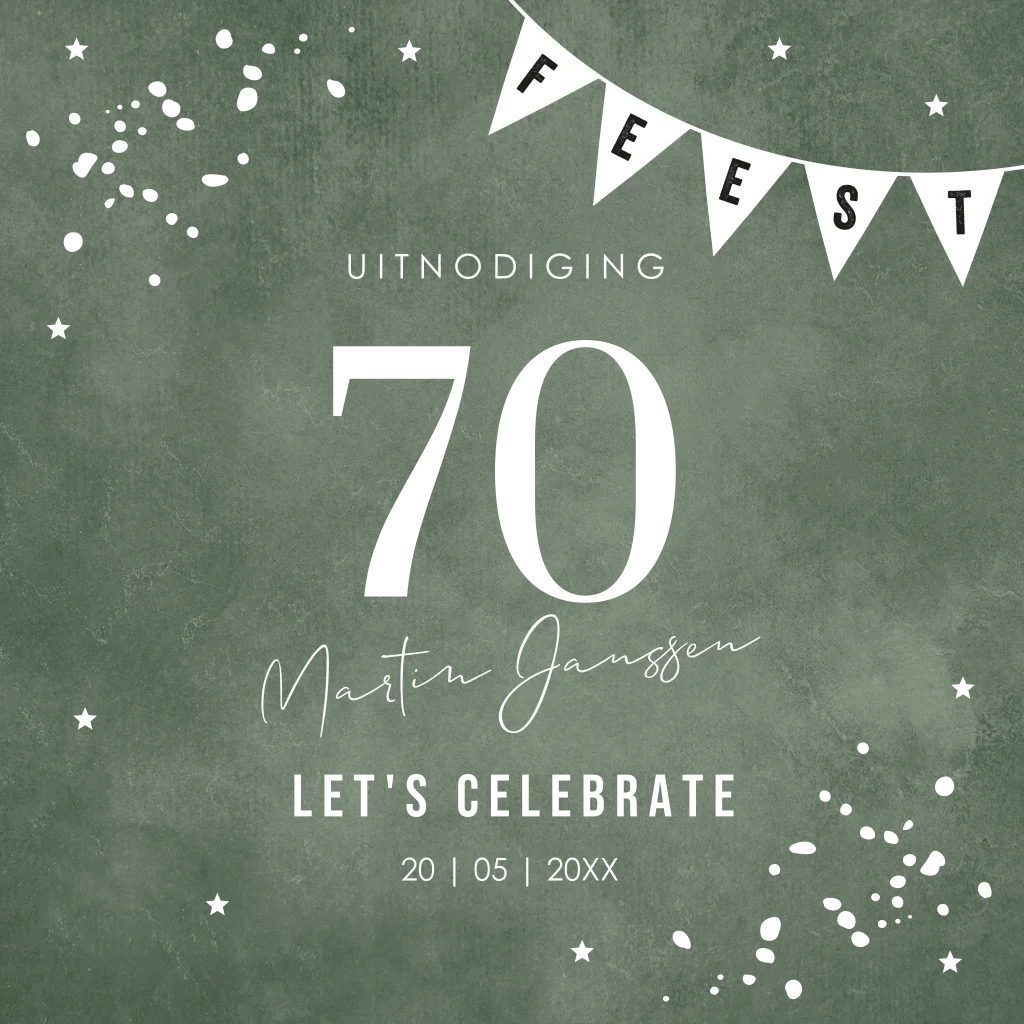 Uitnodiging verjaardag 70 jaar groen man goudfolie slinger
