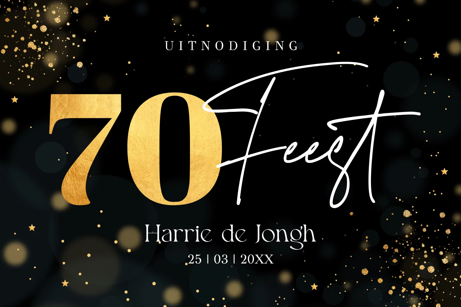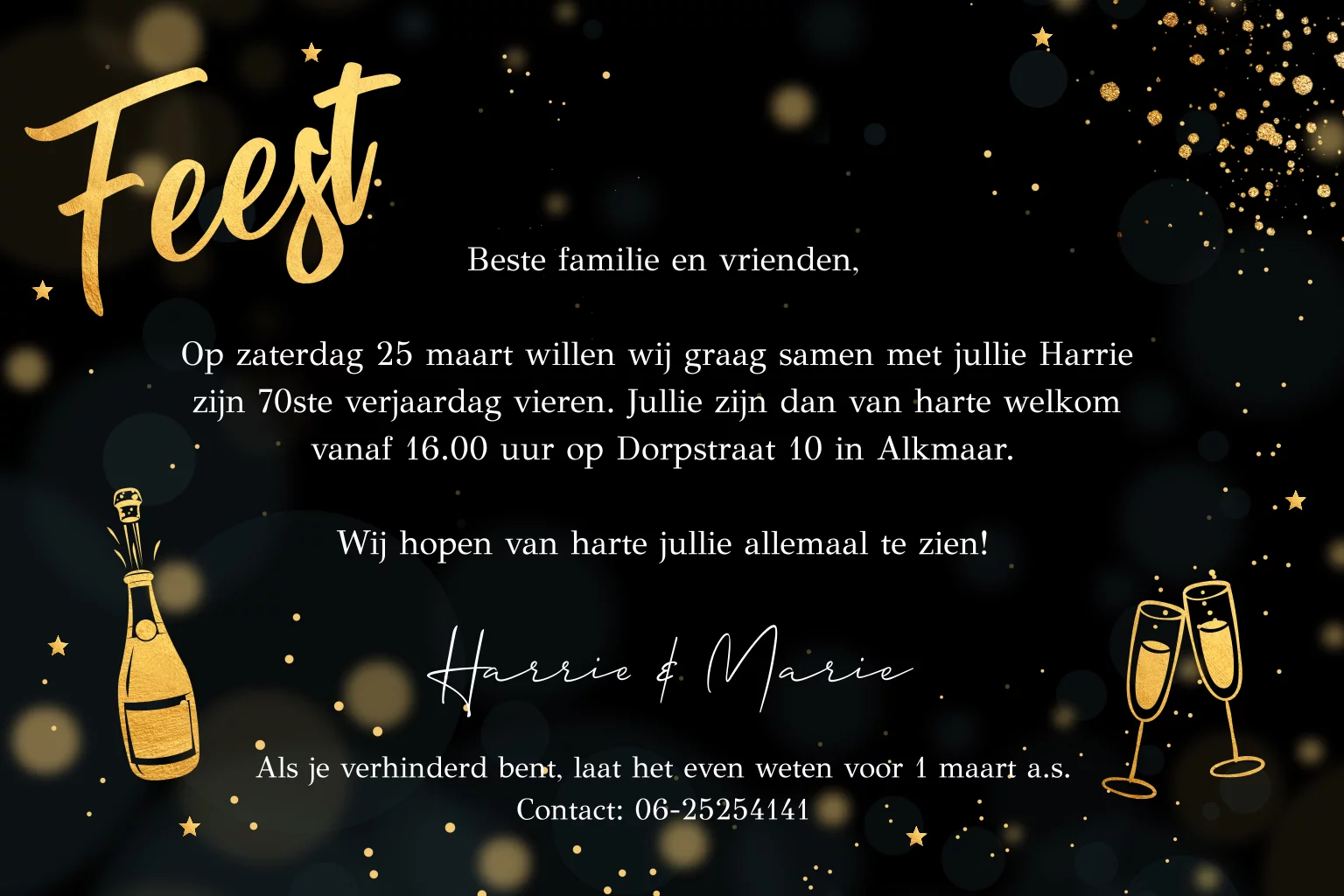 Uitnodiging verjaardag 70 jaar zwart met goudlook spetters. Geen folie!
