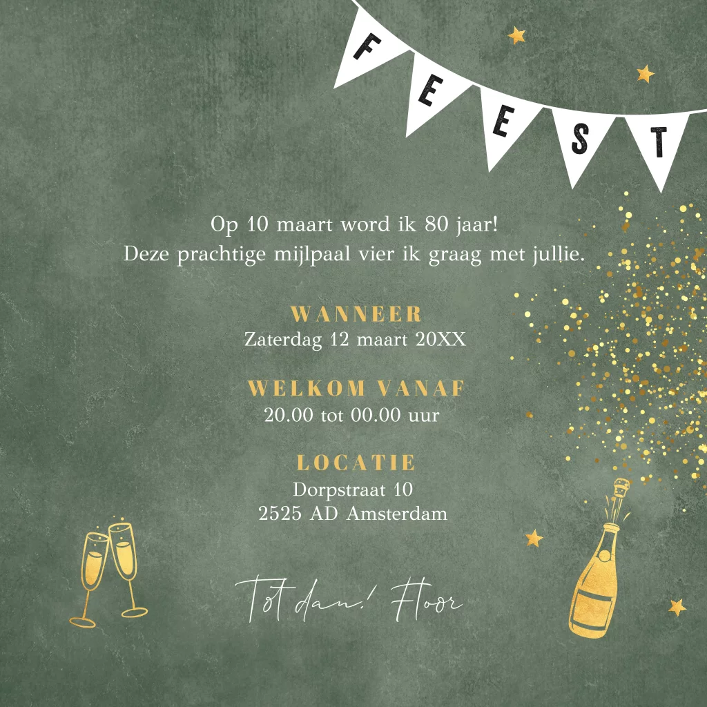 Uitnodiging verjaardag 80 jaar groen voor een vrouw met foto's, goudlook champagne, slinger en feestelijke confetti. Geen folie!