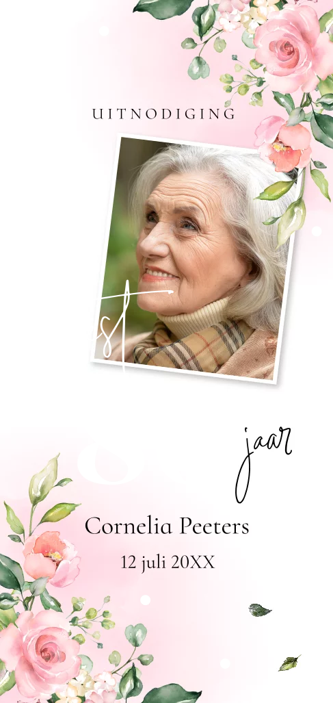 Uitnodiging verjaardag vrouw 80 jaar langwerpig met eigen foto, roze bloemen, watercolour en goudfolie.