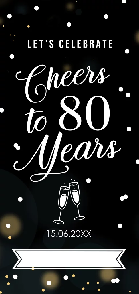 Uitnodiging verjaardag 80 jaar zwart langwerpig met confetti en goudfolie.