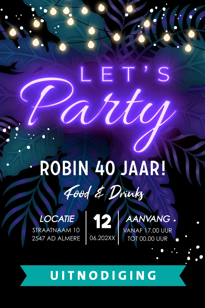 Uitnodiging verjaardag met neon letters " Let's Party", tropische bladeren lampjes en goudfolie.