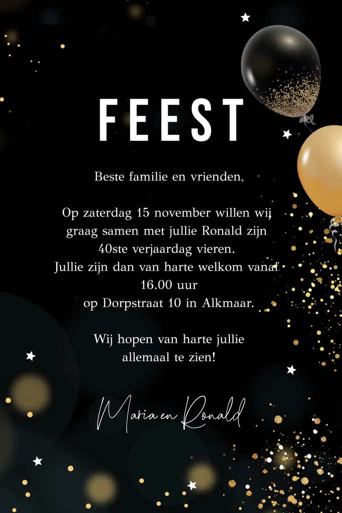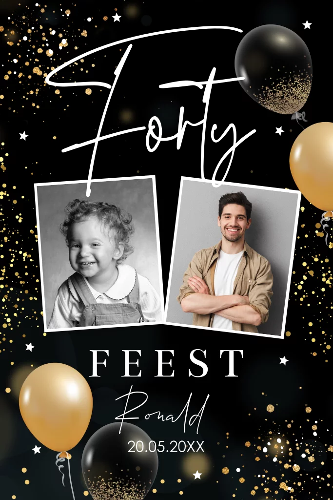 Uitnodiging verjaardag zwart 40 jaar met foto's, ballonnen en goudfolie.