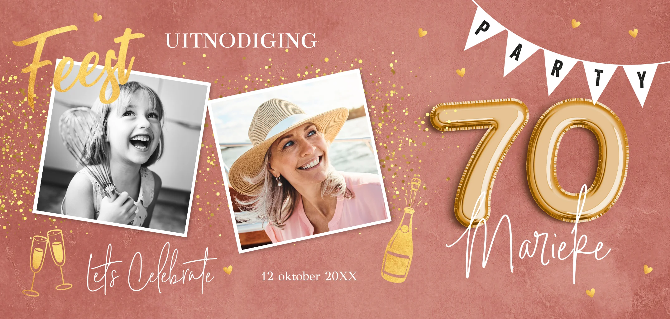 Deze prachtige uitnodiging in terraroze met goudlook accenten is perfect voor een vrouw die haar 70e verjaardag viert. De uitnodiging straalt feestelijkheid en elegantie uit, met een vrolijke slinger, ballonnen en een vleugje goudlook. Geen folie!