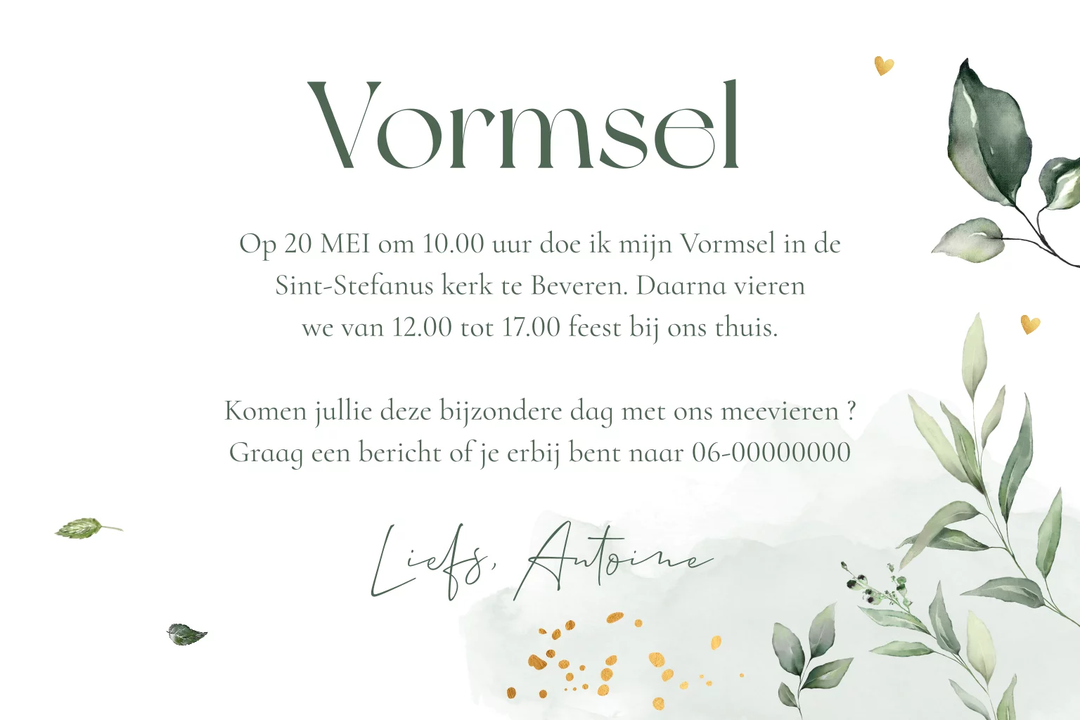 Uitnodiging vormsel groen met waterverf bladeren en goudlook hartjes. Geen folie!