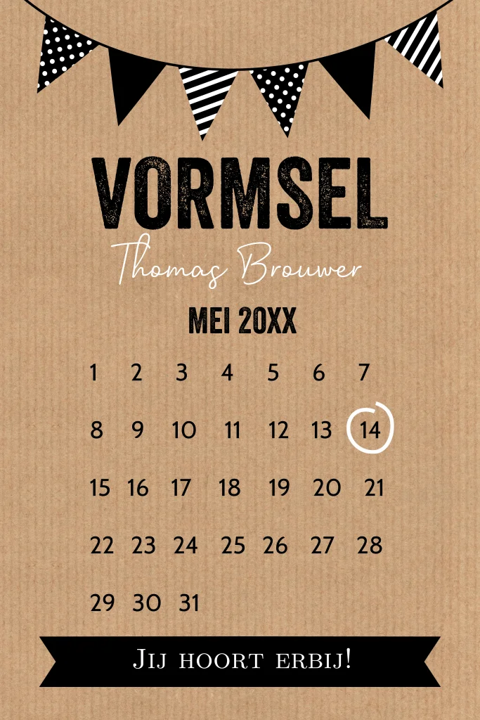 Uitnodiging vormsel uitnodiging met kalender en kraftlook.
