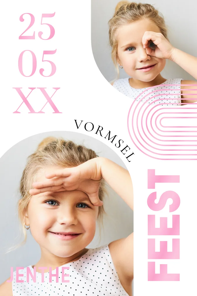 Uitnodiging vormsel voor een meisje met foto 's in boogvorm en hoogglans roze. Pas de kleur van de hoogglans naar wens aan!