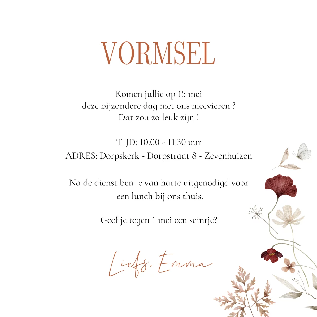 Uitnodiging vormsel meisje waterverf bloemenkrans