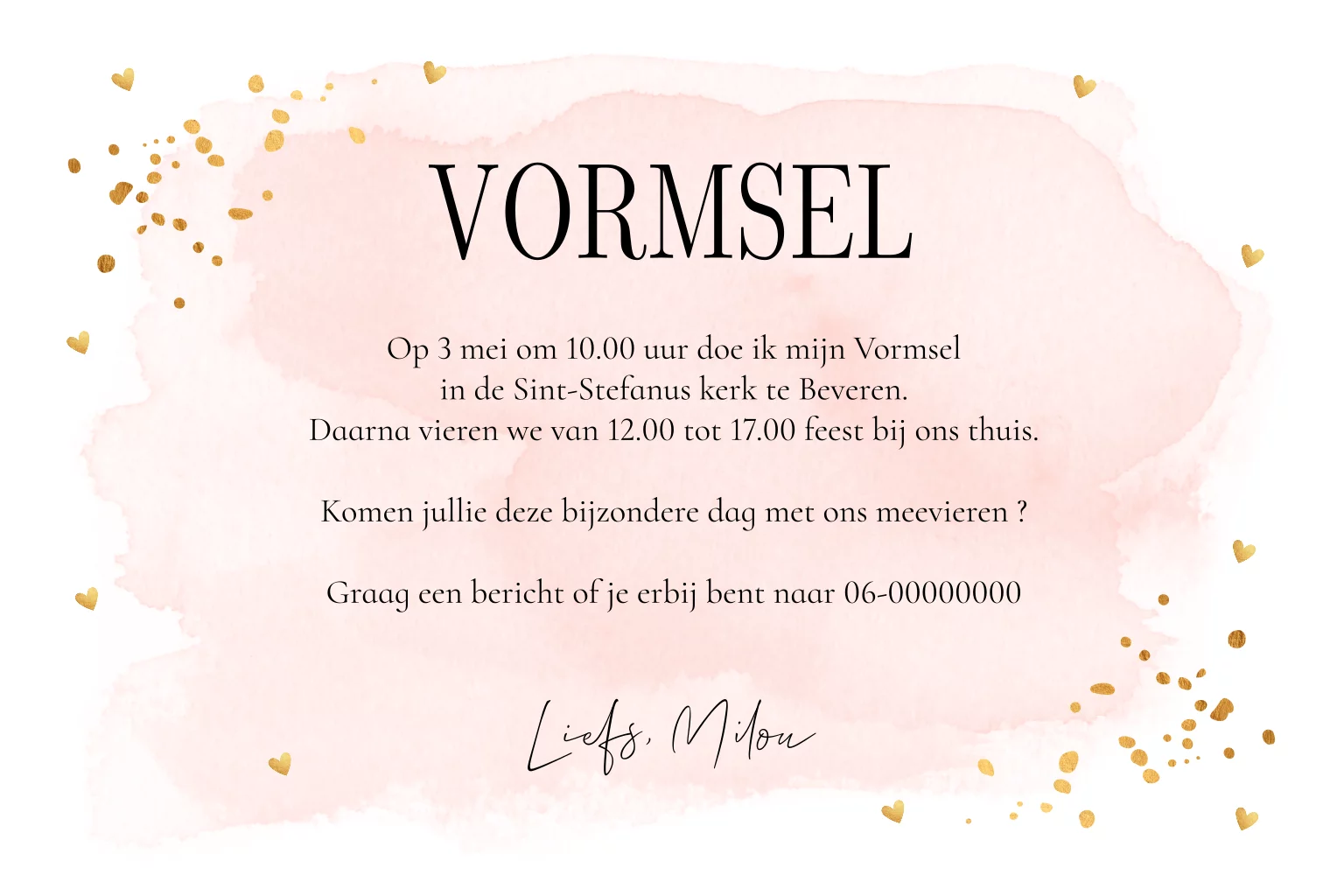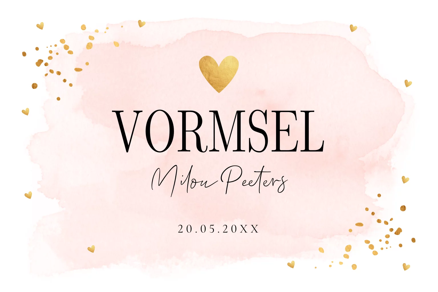 Uitnodiging vormsel voor een meisje met waterverf en goudlook spetters. Geen folie!