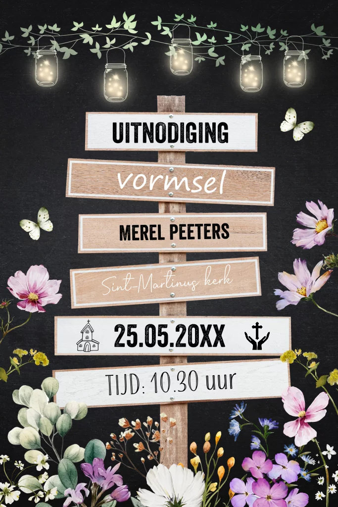 Uitnodiging vormsel voor een meisje met wegwijzer, lampjes en bloemen.