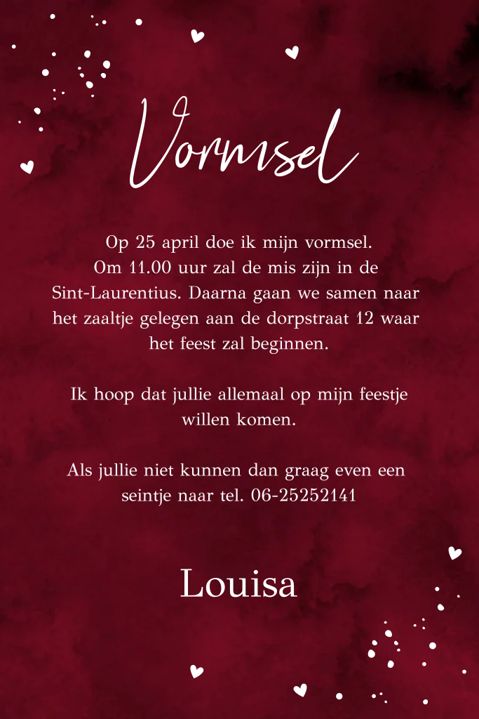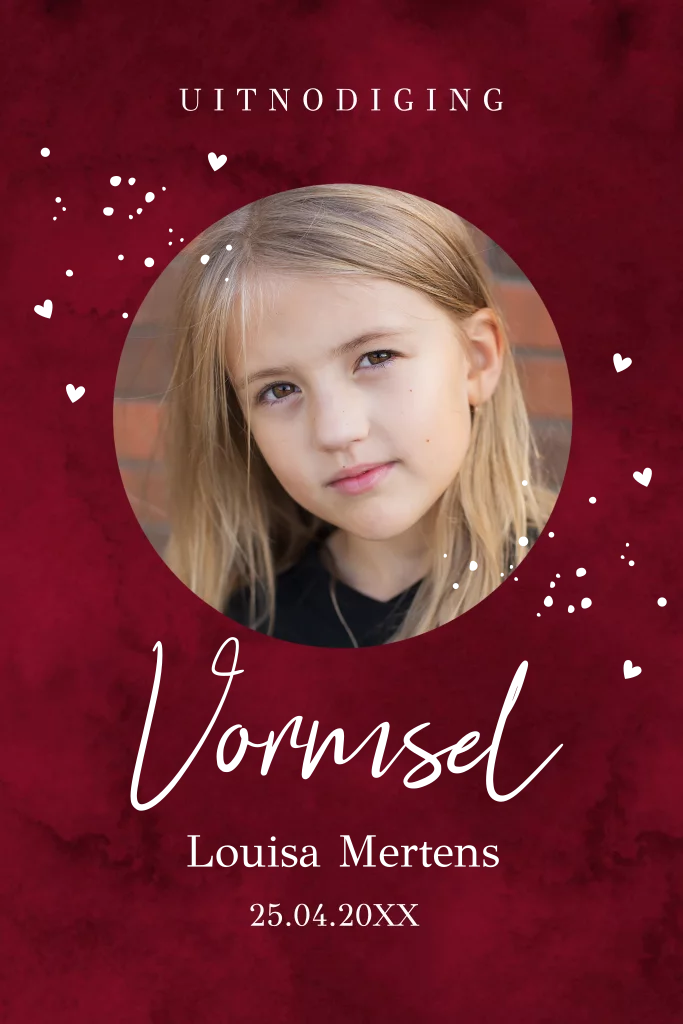 Op zoek naar een stijlvolle vormsel uitnodiging in rood voor een meisje? Deze prachtige uitnodiging is perfect voor het vieren van deze bijzondere gelegenheid. Met een ronde foto en subtiele goudfolie accenten, straalt deze uitnodiging elegantie en klasse uit.