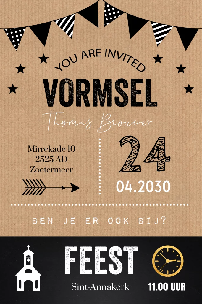 Uitnodiging Vormsel met vlaggenlijn, typografie en kraftlook.