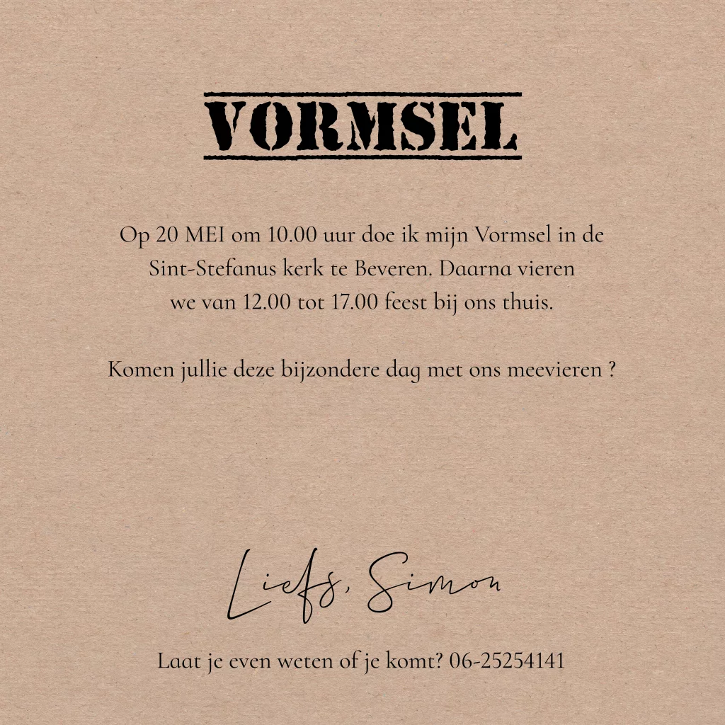 Uitnodiging vormsel zwart wit met kraft labelprint.